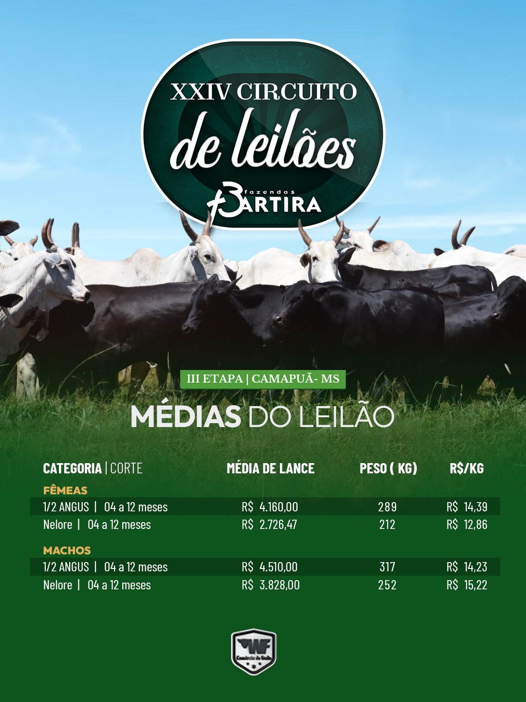 | 1/2 ANGUS | 04 A 12 MESES | 289 | R$ 4.160,00 | R$ 14,39 |